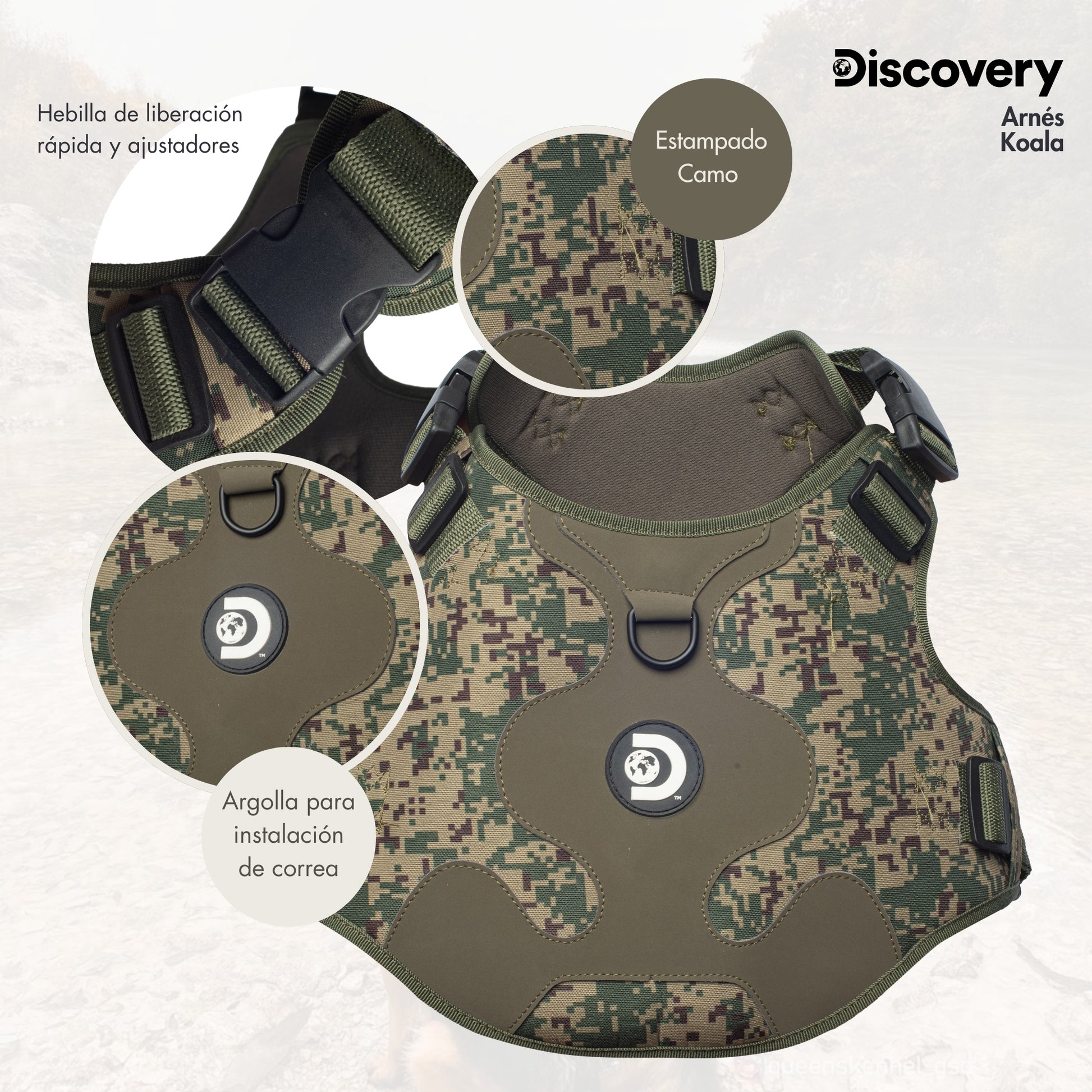 Dale a tu mascota seguridad, comodidad y estilo con el arnés para perro Koala en color verde. Fabricado en sintético, broches de plástico ajustable y herraje metálico. Aplicación de la marca en plastisol. Disponible en dos colores. ¡Discovery Pets, ideal para las aventuras con tu mejor amigo!
